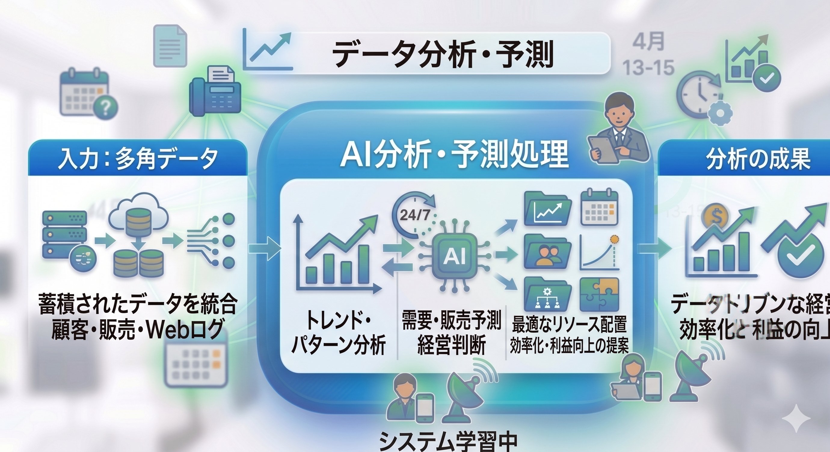 蓄積されたデータからトレンド分析・需要予測・最適なリソース配置をAIが提案。経営判断をデータドリブンに。